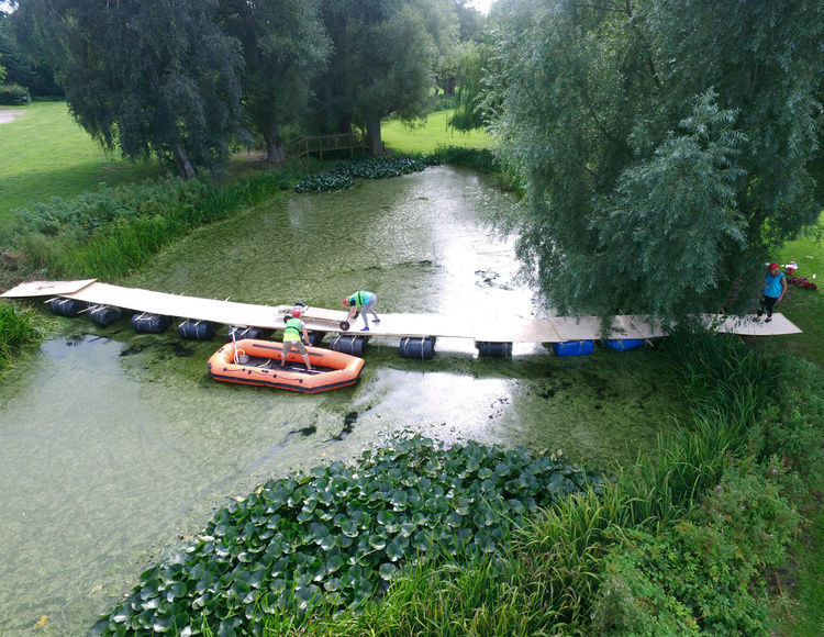 Aktiviteten gennemføres typisk udendørs ved et område med plads, ofte ved vand, og faciliteres af instruktører. Der arbejdes med materialer, konstruktion og koordinering i et engagerende setup.